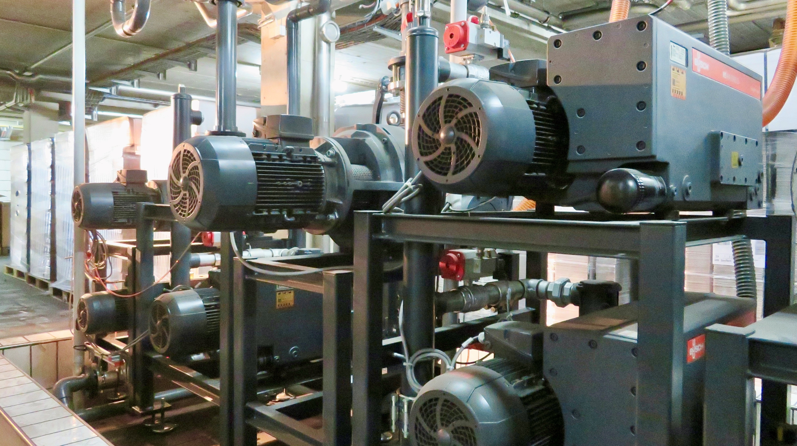 De fem pakningslinjer forsynes med vakuum fra et separat maskinrum. Her genererer et trykstyret vakuumsystem fra Busch, bestående af tre R5 lamelvakuumpumper, tre PANDA vakuumboostere, styreskab og vakuum beholder, det nødvendige vakuumniveau – præcist tilpasset til fugtindholdet i hver enkelt ostetype. Dette bruges ikke kun til termoformning af de forskellige typer emballage, vakuumpakning og forsegling, men også til at samle de store forsendelseskasser og placere den pakkede ost i dem.