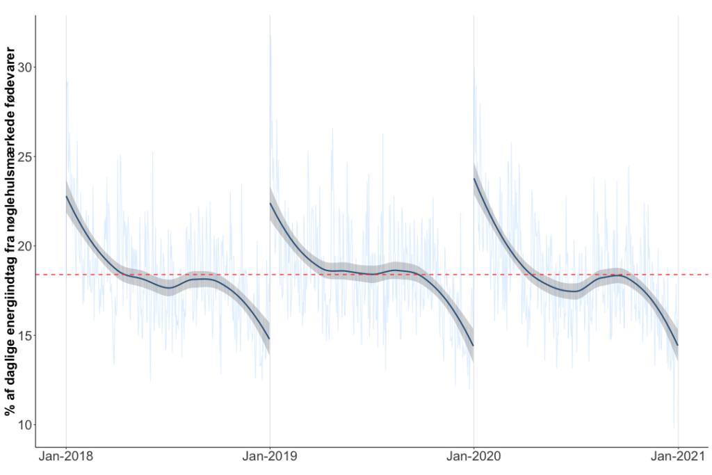Men desværre bliver vi hurtigt indhentet af virkeligheden og de gamle vaner, viser nye beregninger fra Institut for Fødevare- og Ressourceøkonomi på Københavns Universitet. Tallene viser nemlig, at når det kommer til indkøb af sunde fødevarer, så starter vi det nye år ud som lyn og torden og fylder indkøbskurven med mindre sukker, mindre fedt og salt, samt flere kostfibre og fuldkorn. Men derfra går det støt og sikkert den forkerte vej resten af året. Og mønstret gentager sig år efter år.